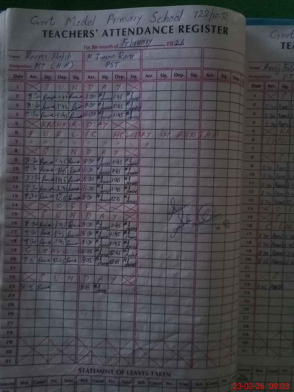 | Name: Re**** Ha**** Designation: (School Headmaster's/Headmistress's) PST Phone/Cell Number: 03**** |