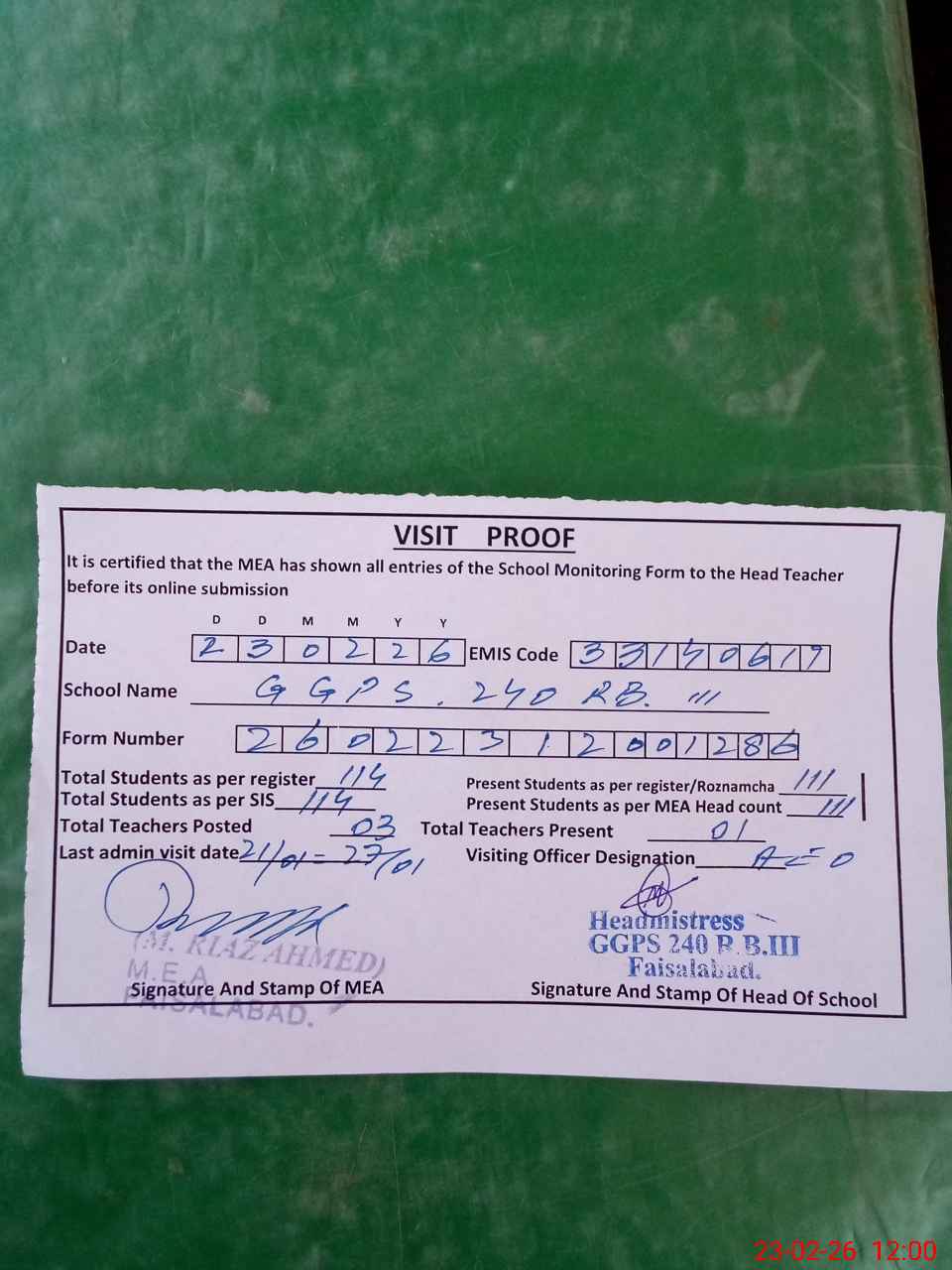 | Attendance Register | Head Teacher | MEA with School | Visit Proof |