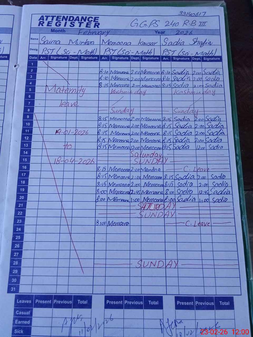 | 33**** | Sa**** Mu**** | PST Science/Maths | Regular | 12 | 0 | 0 | 12 | 0 | 0 | 0 | 0 | 0 | Maternity |