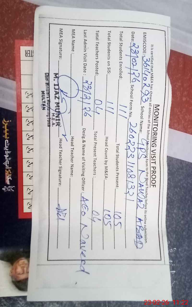 | EMIS Code: 36140293 | Name of School: GPS NAWAZ ABAD MOUZA SHADI KACHALA P/O GHAZI PUR | |||