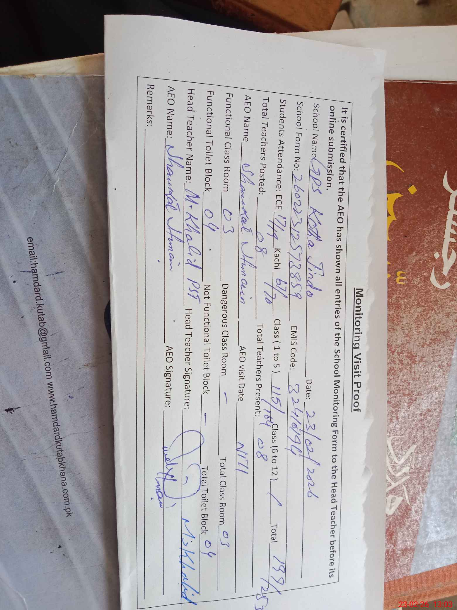 | Attendance Register | Head Teacher | MEA with School | Visit Proof |