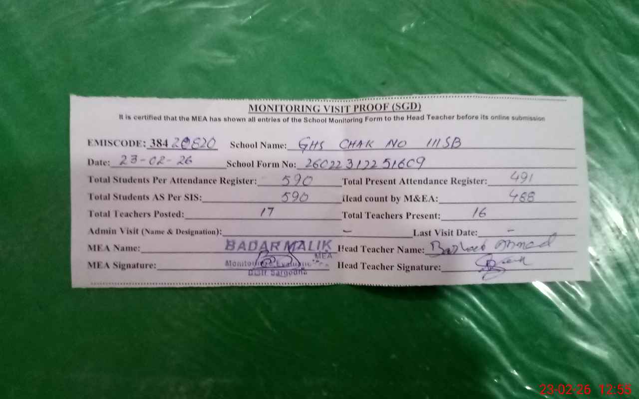 | EMIS Code: 38420820 | Name of School: GHS CHAK NO.111 SB | |||
