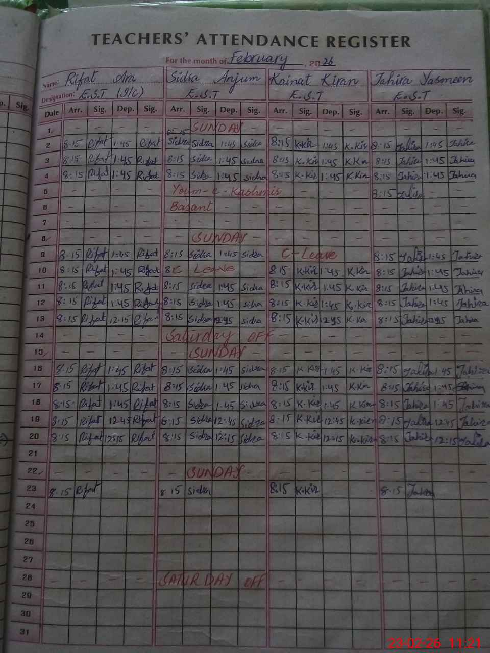 | Total Students Present | 0 | 0 | 23 | 23 | 19 | 32 | 20 | 26 | 20 | 23 | 216 | |||||