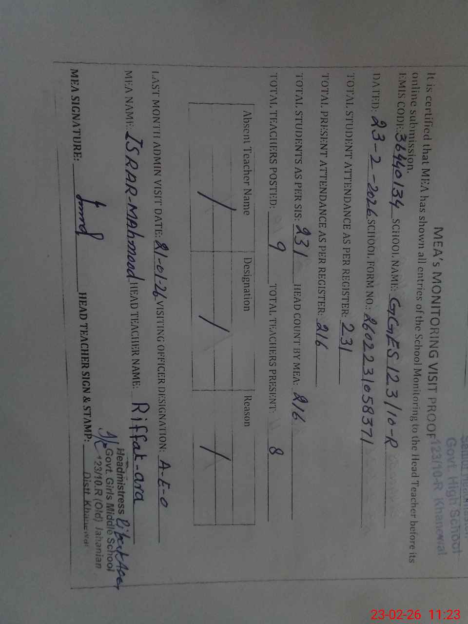 | Attendance Register | Head Teacher | MEA with School | Visit Proof |
