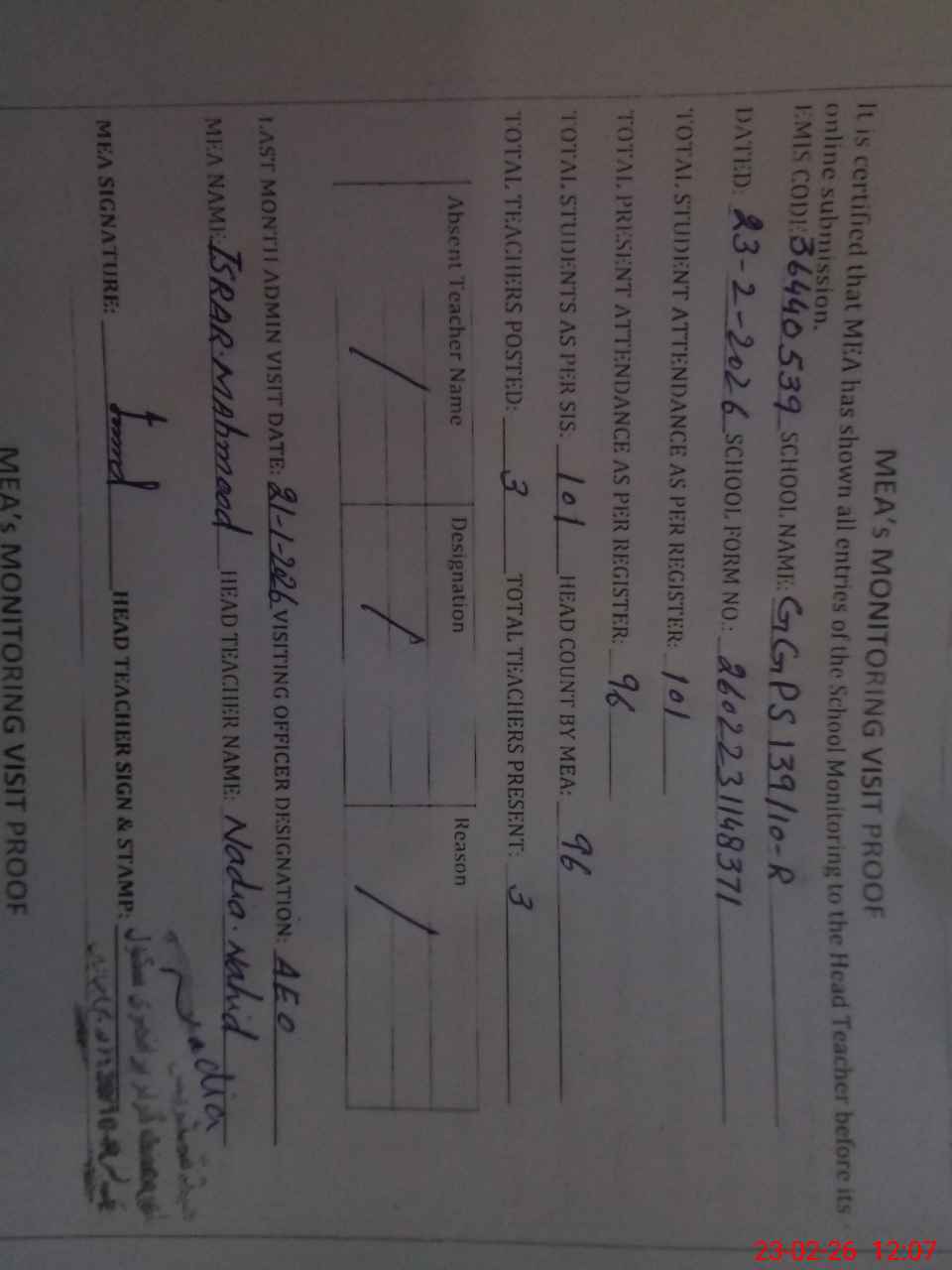 | Attendance Register | Head Teacher | MEA with School | Visit Proof |