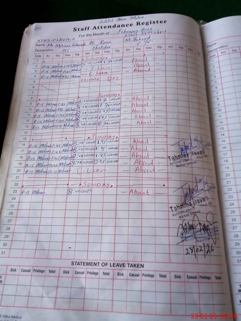 | 37**** | Mu**** Sh**** | C IV | Regular | 0 | 0 | 31 | 0 | 0 | 0 | 0 | 0 | 0 | Absent (Un-Authorized) |