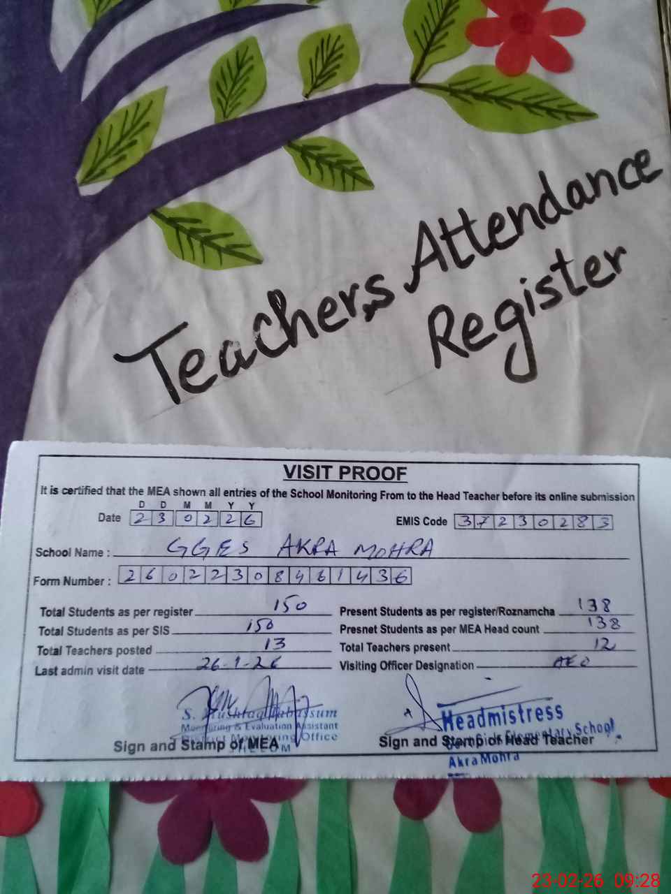 | Attendance Register | Head Teacher | MEA with School | Visit Proof |