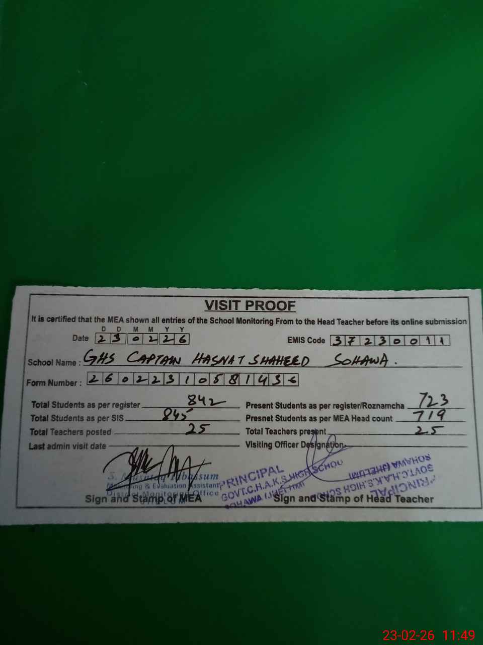 | EMIS Code: 37230011 | Name of School: GHS CAPTAIN HASNAT SHAHEED SOHAWA | |||
