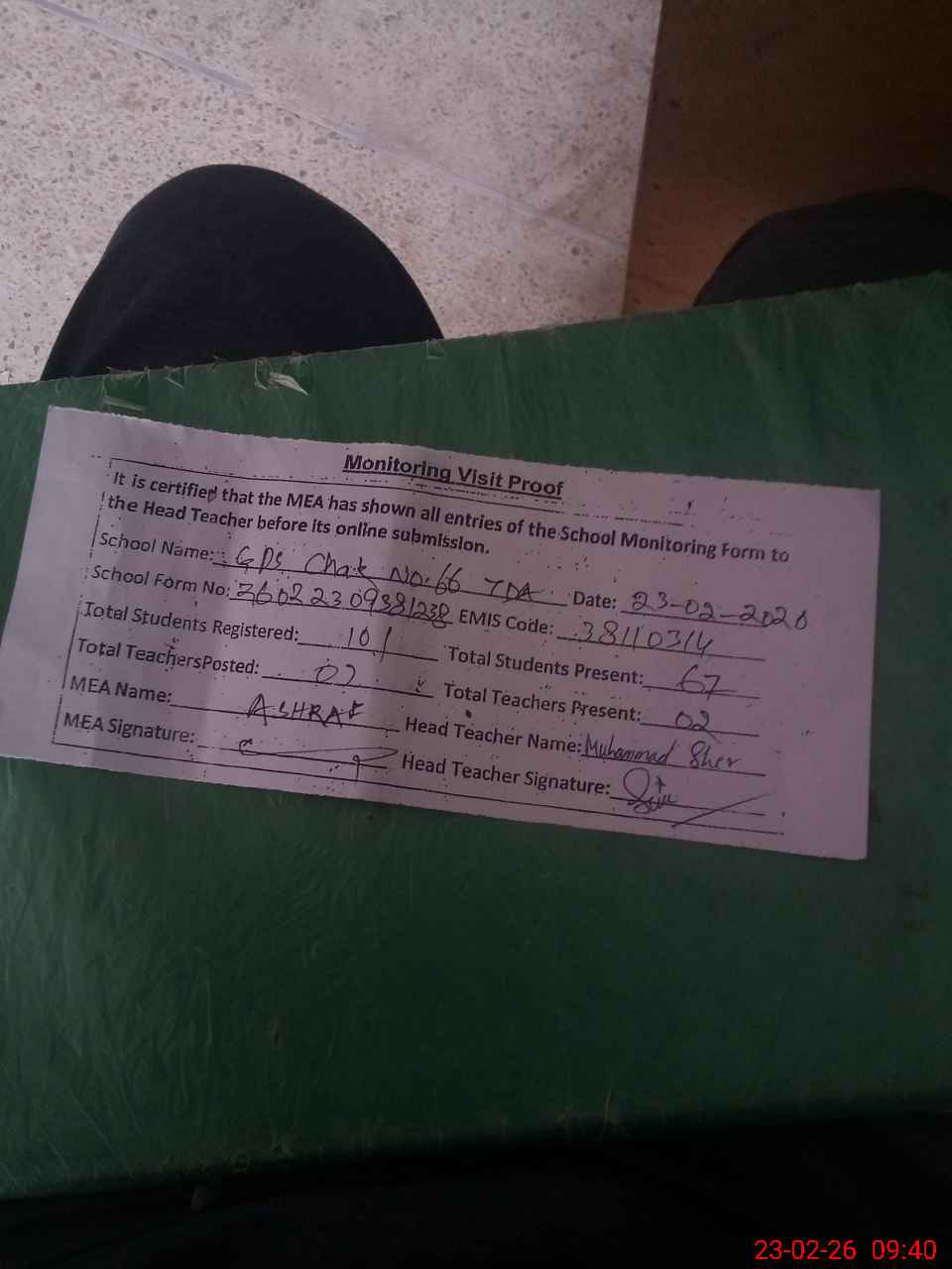 | Attendance Register | Head Teacher | MEA with School | Visit Proof |