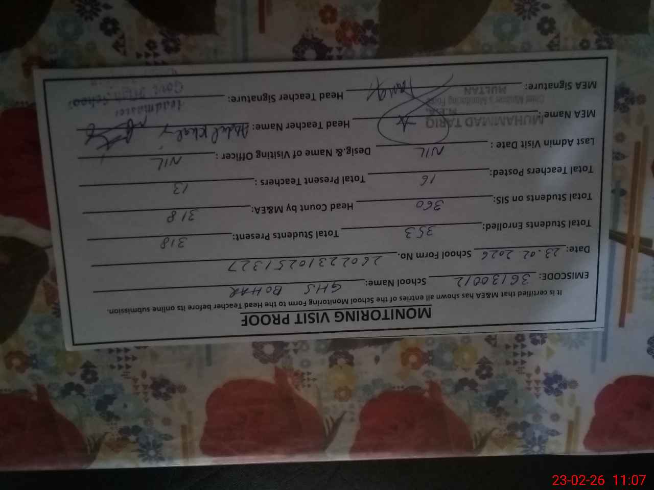 | Certified that this School was Inspected by the Undersigned MEA/DMO Today and the Information Stated Above is as Per Record. | |||||