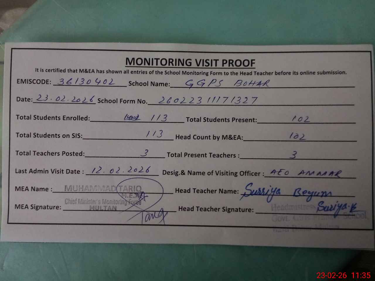 | Attendance Register | Head Teacher | MEA with School | Visit Proof |