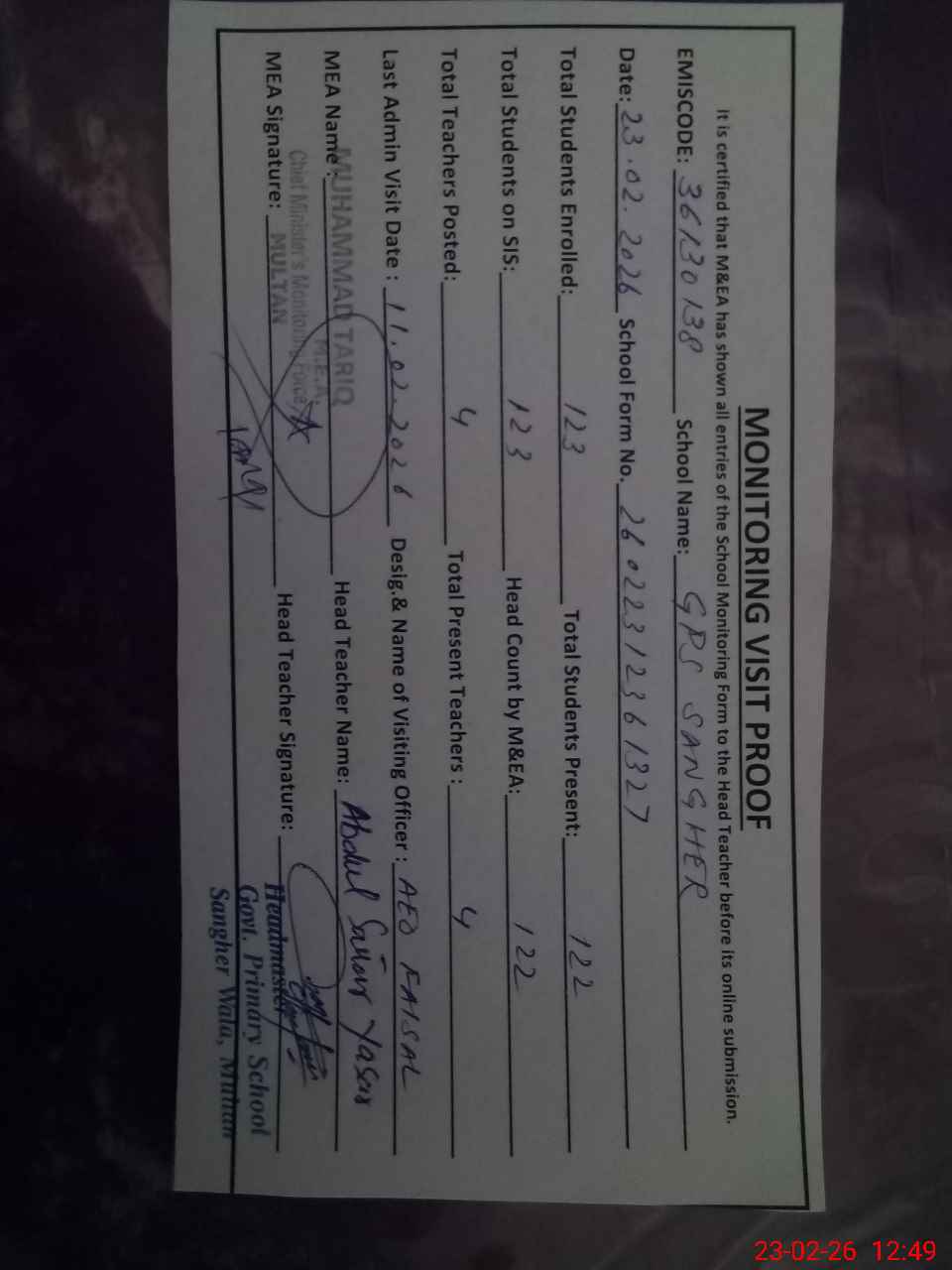 | EMIS Code: 36130138 | Name of School: GPS SANGHER WALA P/O SANGHER WALA | |||