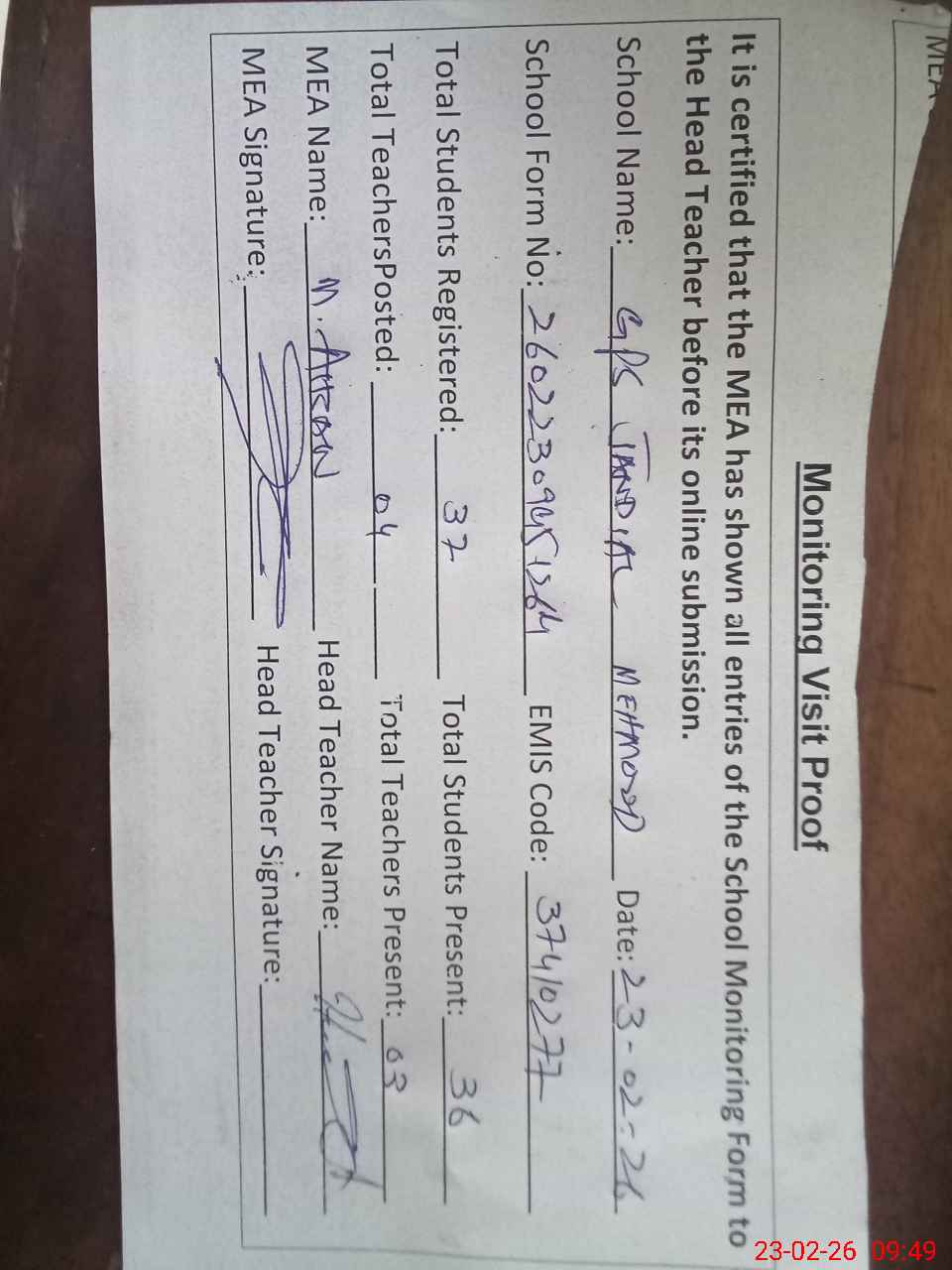 | Attendance Register | Head Teacher | MEA with School | Visit Proof |