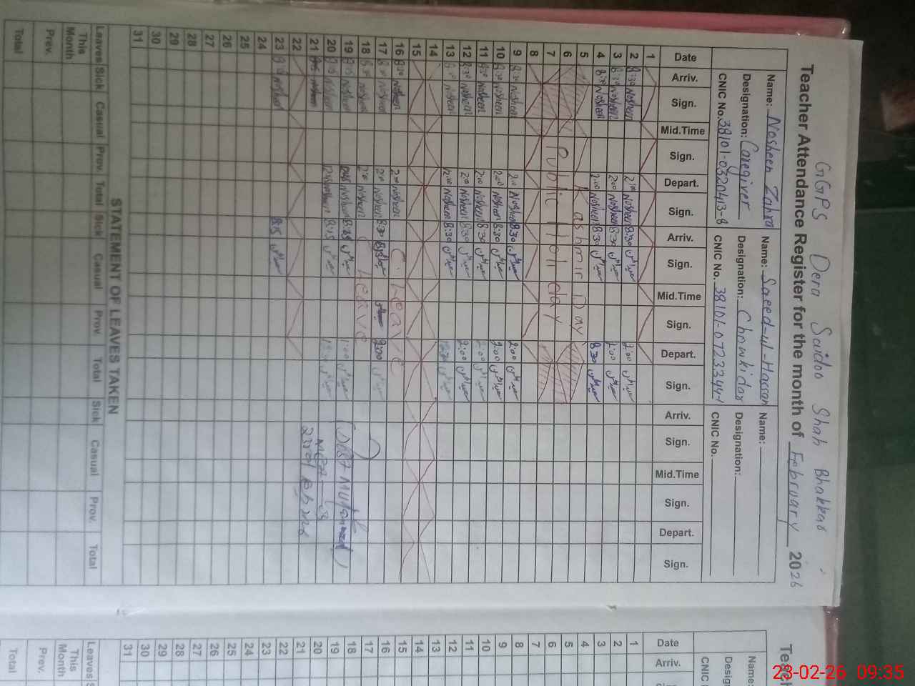 | CNIC | Full Name | Designation | R/C | Absence During Last Calender Month |