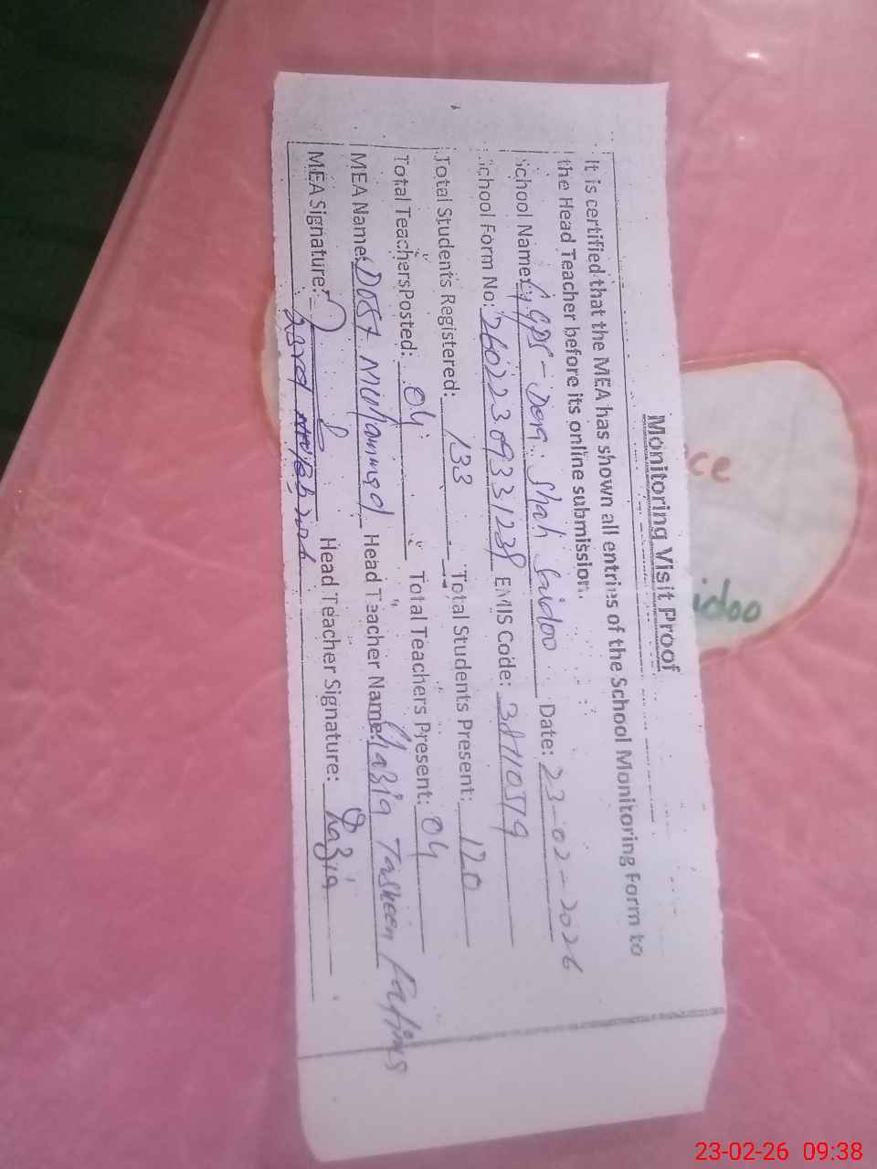 | Attendance Register | Head Teacher | MEA with School | Visit Proof |