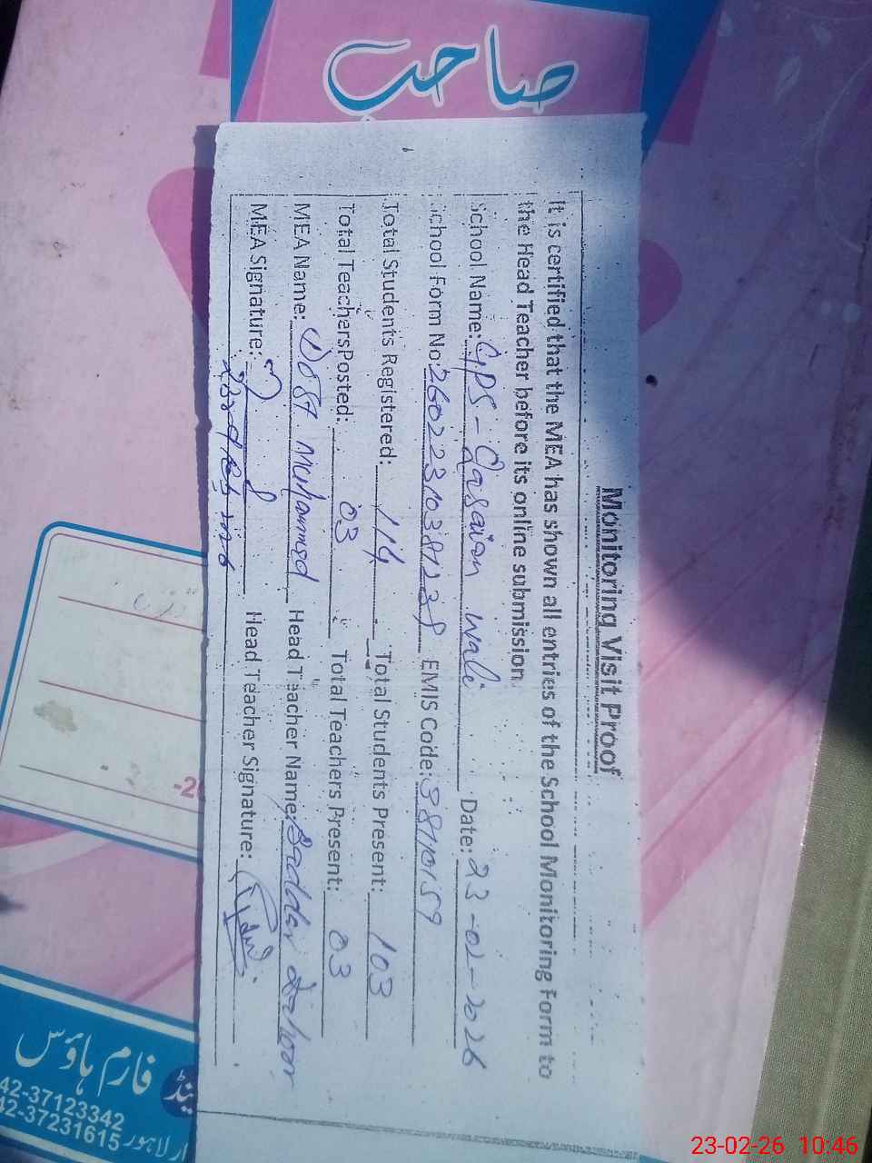 | EMIS Code: 38110159 | Name of School: GPS BASTI QASAIAN WALI | |||