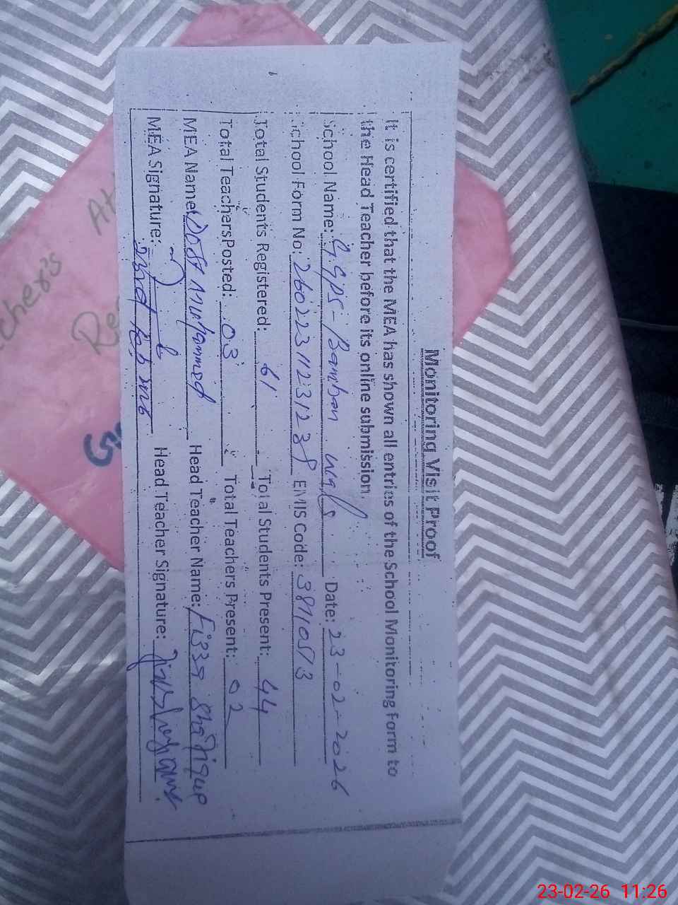 | Attendance Register | Head Teacher | MEA with School | Visit Proof |