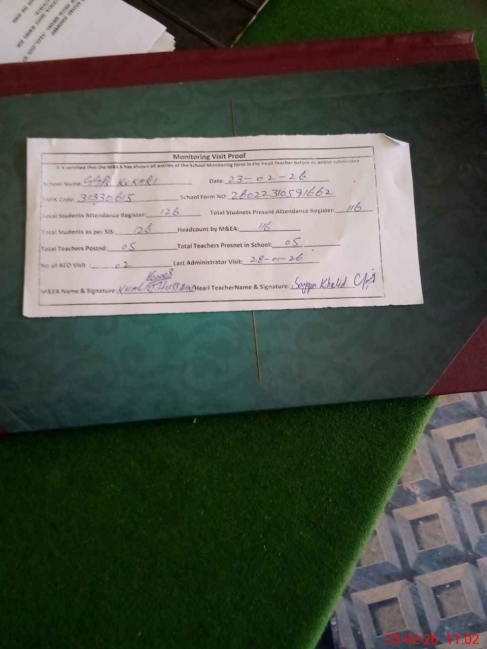 | Attendance Register | Head Teacher | MEA with School | Visit Proof |