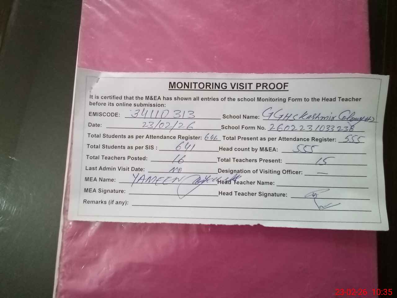 | Attendance Register | Head Teacher | MEA with School | Visit Proof |