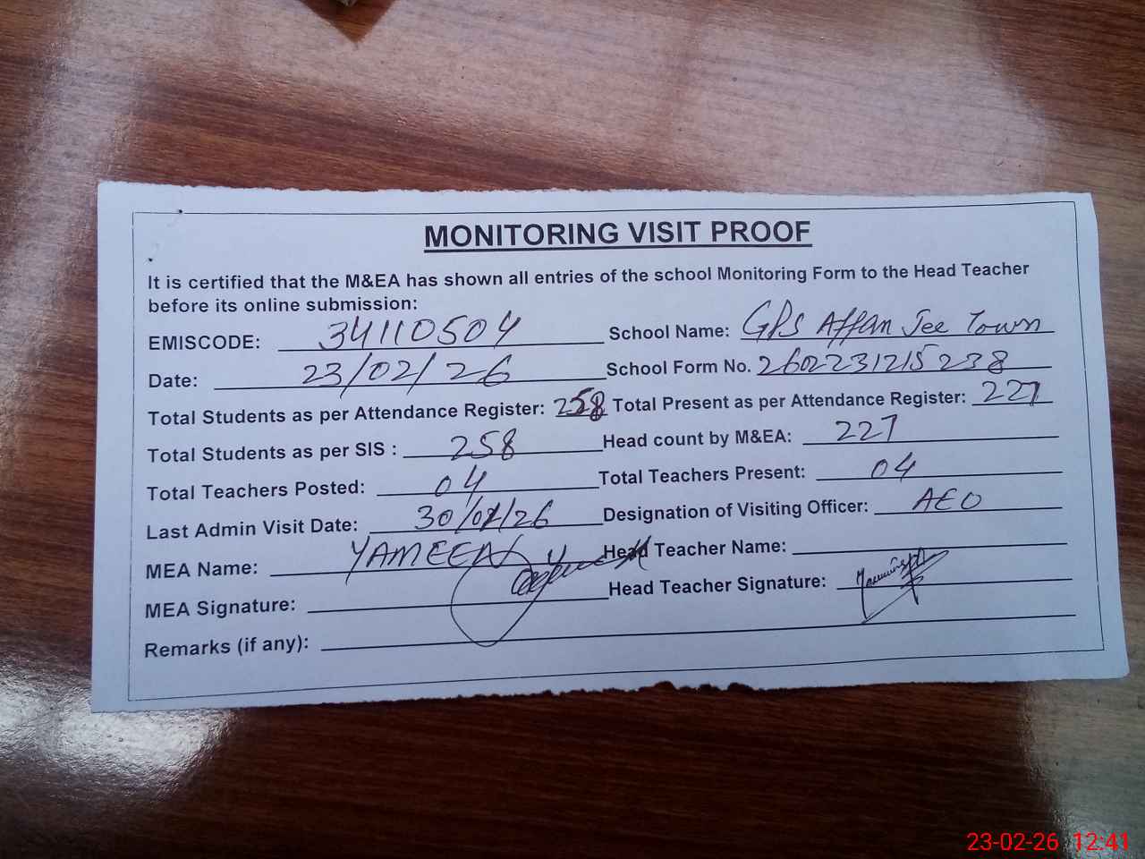 | EMIS Code: 34110504 | Name of School: GPS AFFAN JEE TOWN | |||