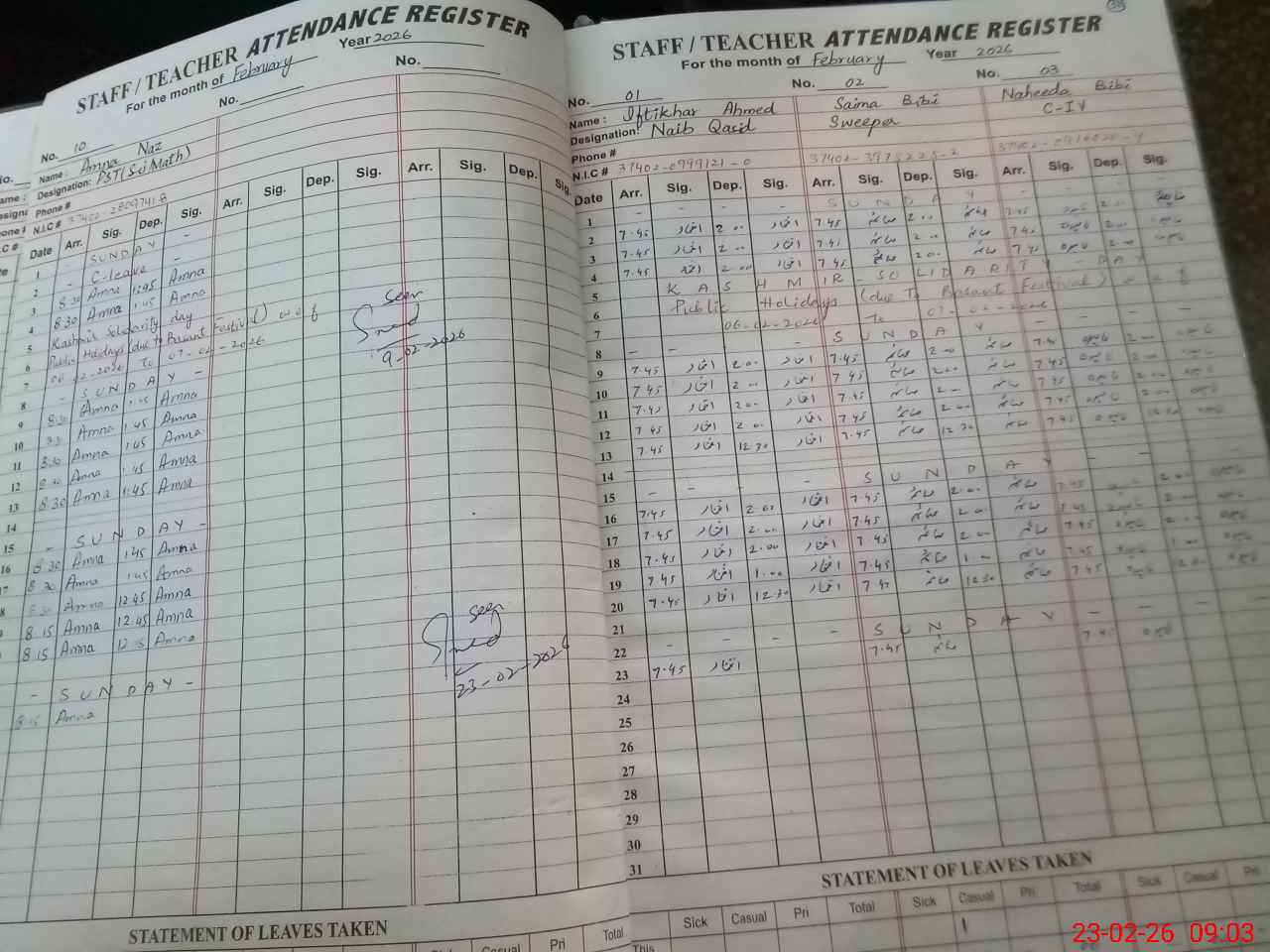 | CNIC | Full Name | Designation | R/C | Absence During Last Calender Month |