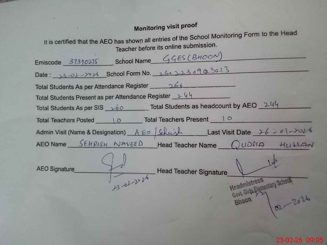 | Attendance Register | Head Teacher | MEA with School | Visit Proof |