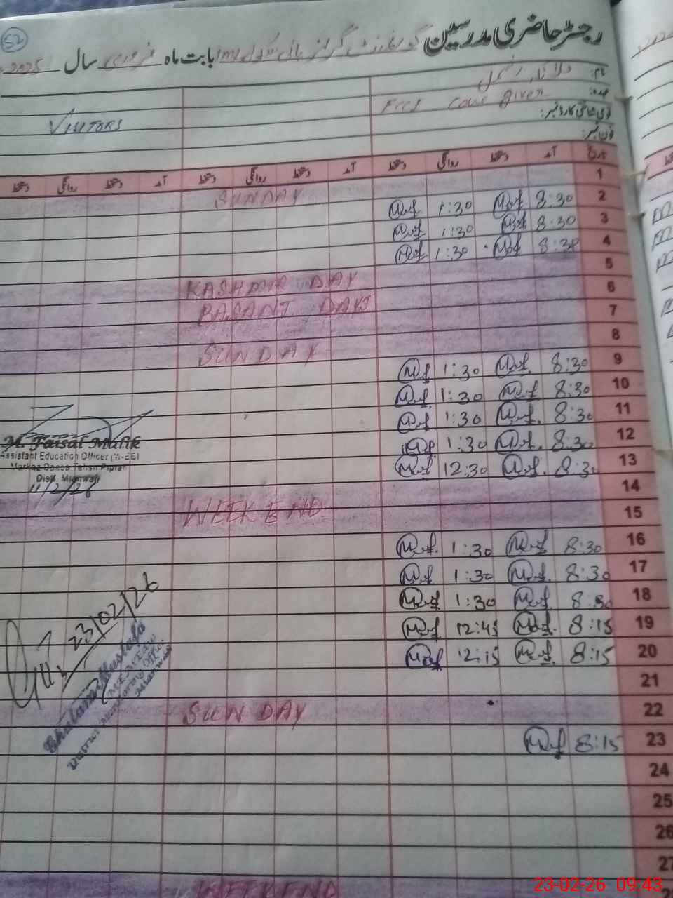 | Total no. of Classrooms: 15 No. of Classrooms Used for Teaching: 11 No. of Classrooms Storing Old Furniture, FTBs, etc: 0Comments if Any: JC NOOR HUSSAIN FAKE ATTENDANCE MARKED OF TODAY BY YESTERDAY AND HEAD INFORM ME THAT HE NOT ARRIVED YET AND HE ARRIVED AT 0920 AM MARKED AS ABSENT |