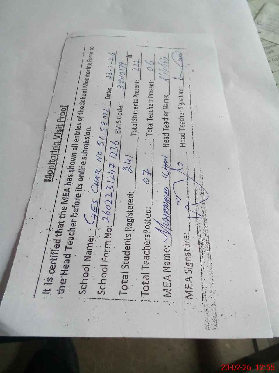| Attendance Register | Head Teacher | MEA with School | Visit Proof |