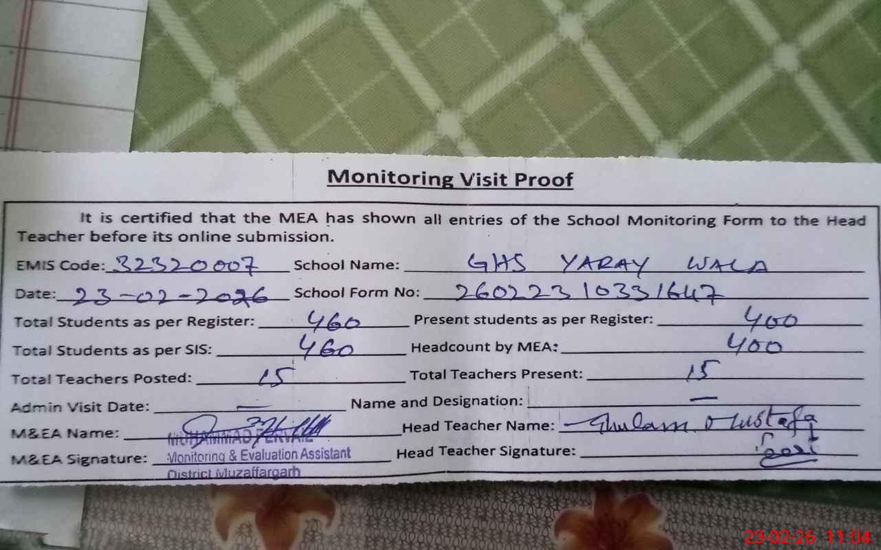 | EMIS Code: 32320007 | Name of School: GHS YARAY WALA | |||