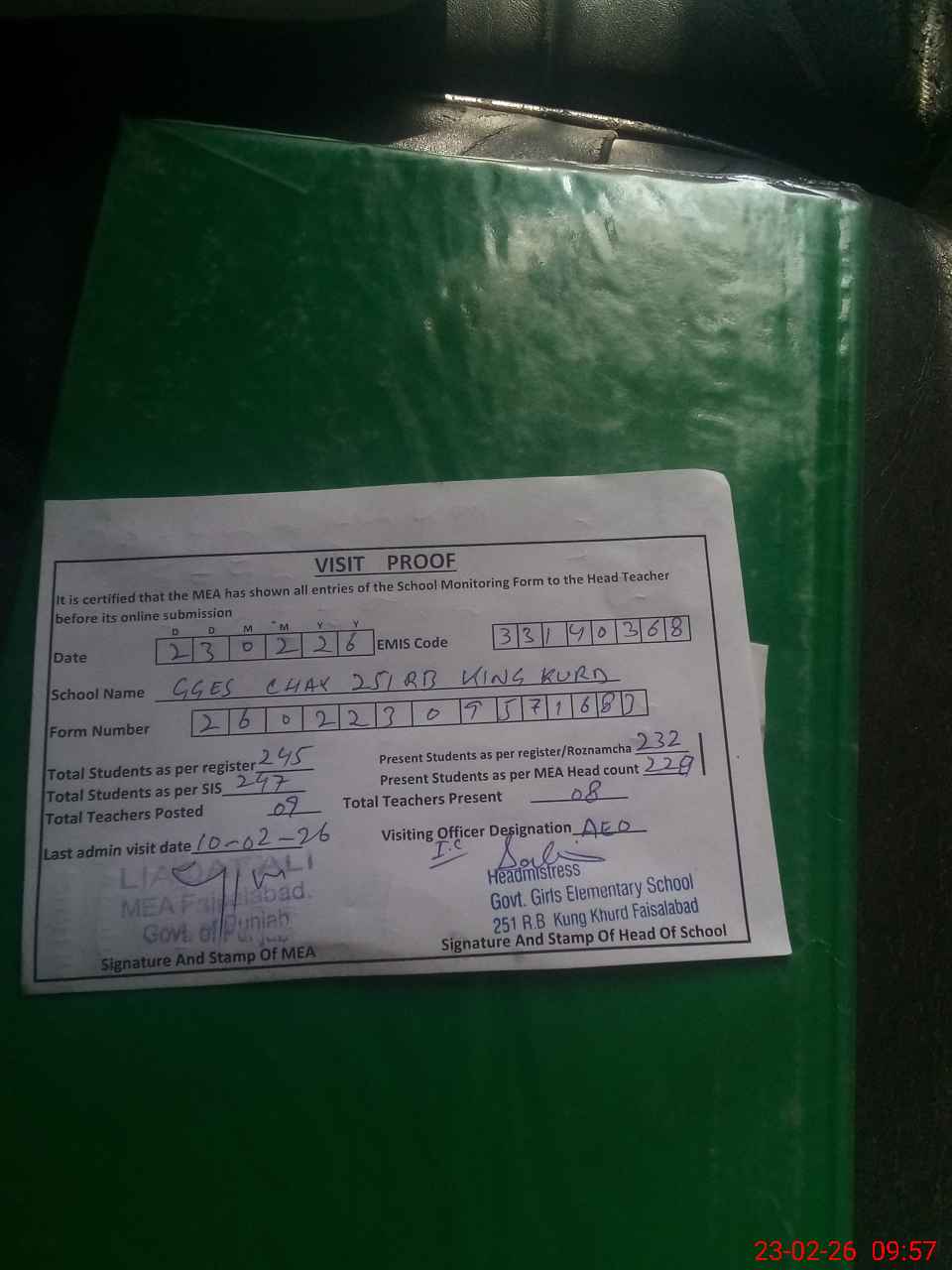 | Attendance Register | Head Teacher | MEA with School | Visit Proof |