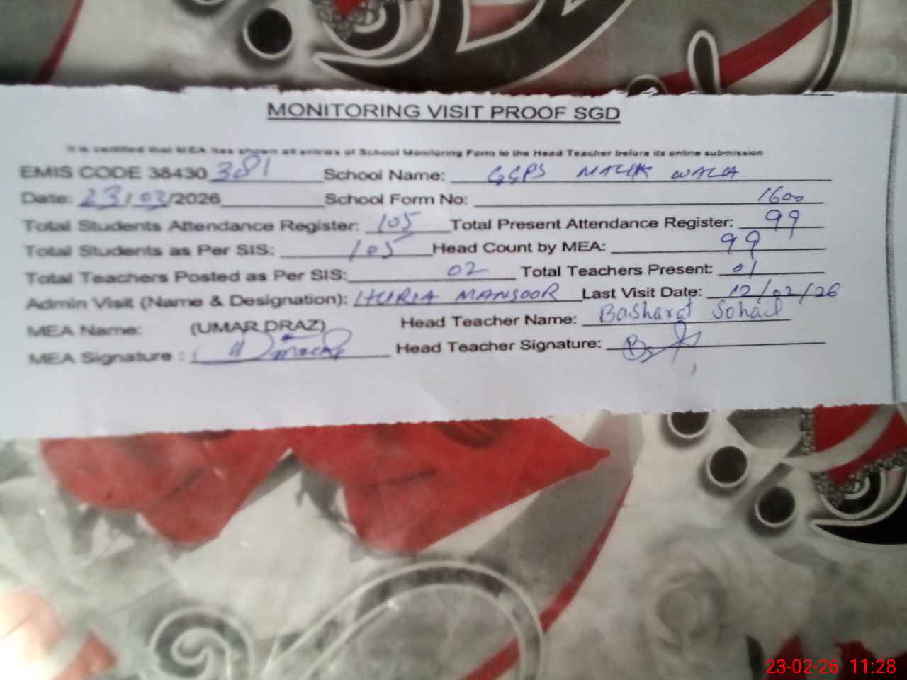 | Attendance Register | Head Teacher | MEA with School | Visit Proof |