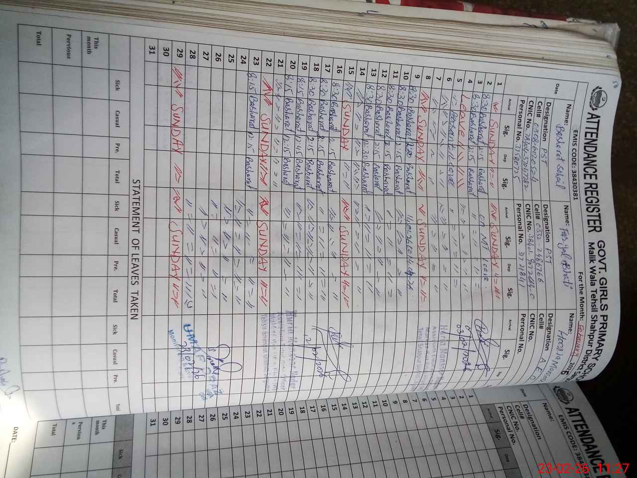 | 38**** | Fa**** Bh**** | PST Science/Maths | Regular | 18 | 0 | 0 | 18 | 0 | 0 | 0 | 0 | 0 | Maternity |
