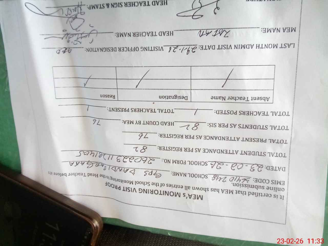 | Attendance Register | Head Teacher | MEA with School | Visit Proof |