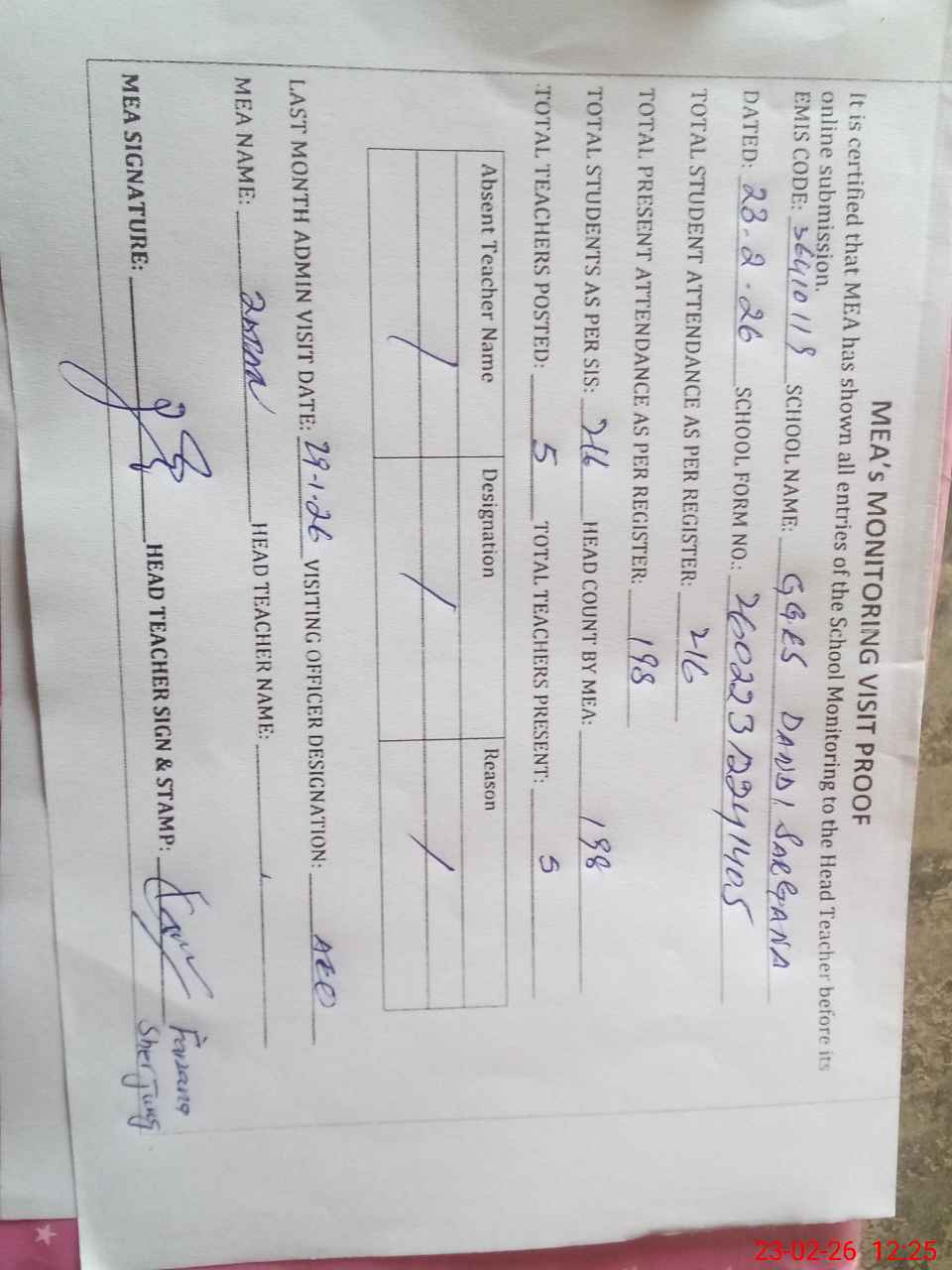 | Attendance Register | Head Teacher | MEA with School | Visit Proof |