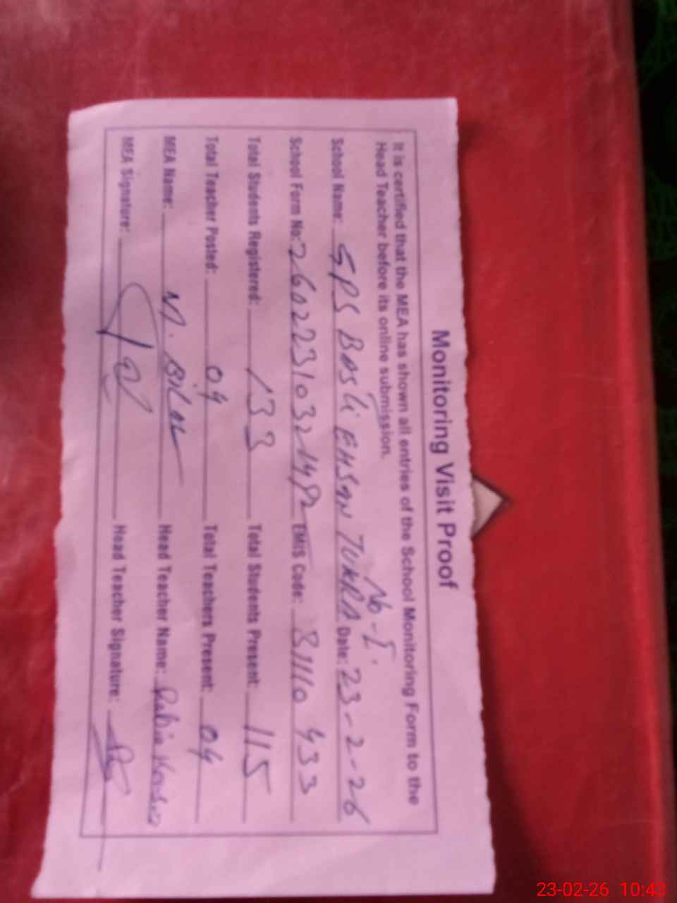 | Attendance Register | Head Teacher | MEA with School | Visit Proof |