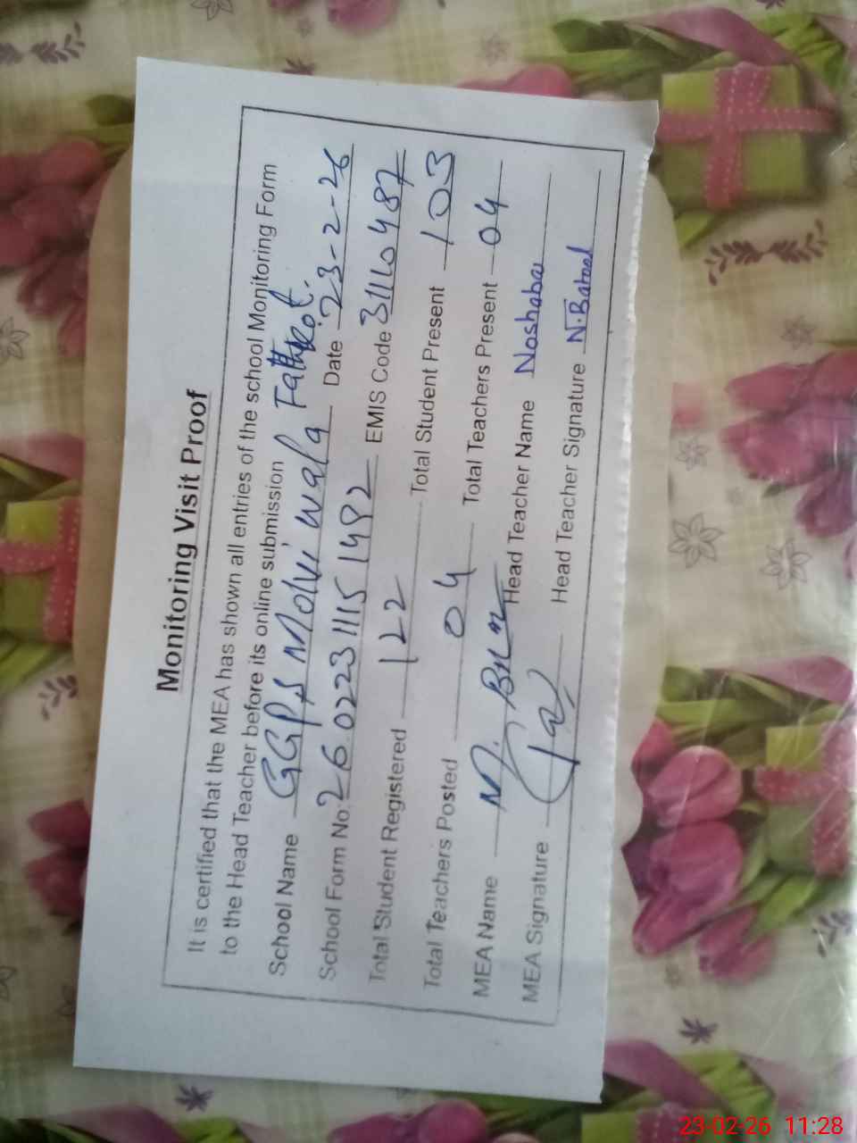 | EMIS Code: 31110487 | Name of School: GGPS MOLVI WALA FATEH KOT | |||