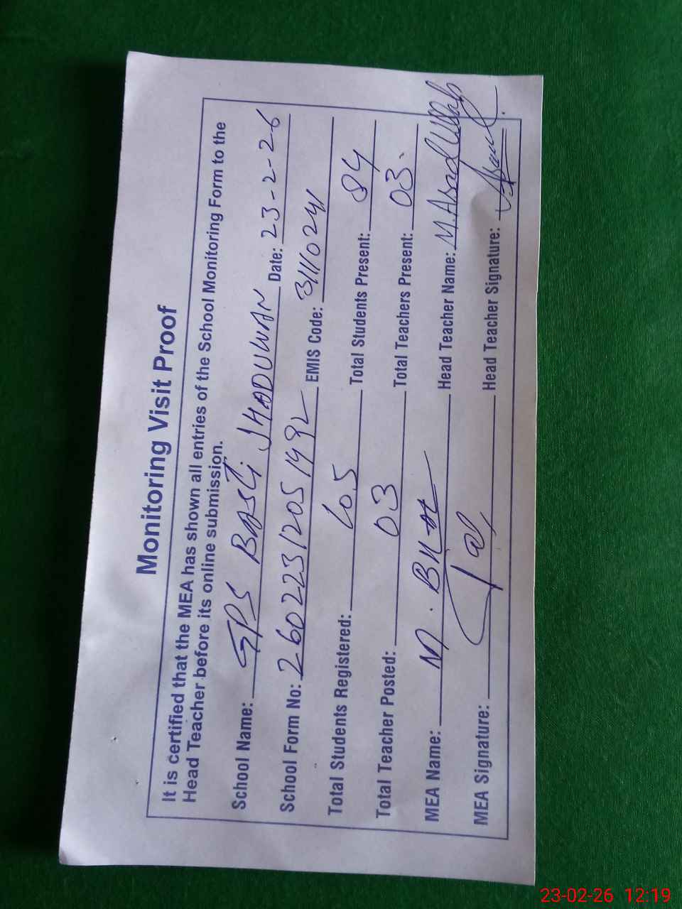 | Certified that this School was Inspected by the Undersigned MEA/DMO Today and the Information Stated Above is as Per Record. | |||||