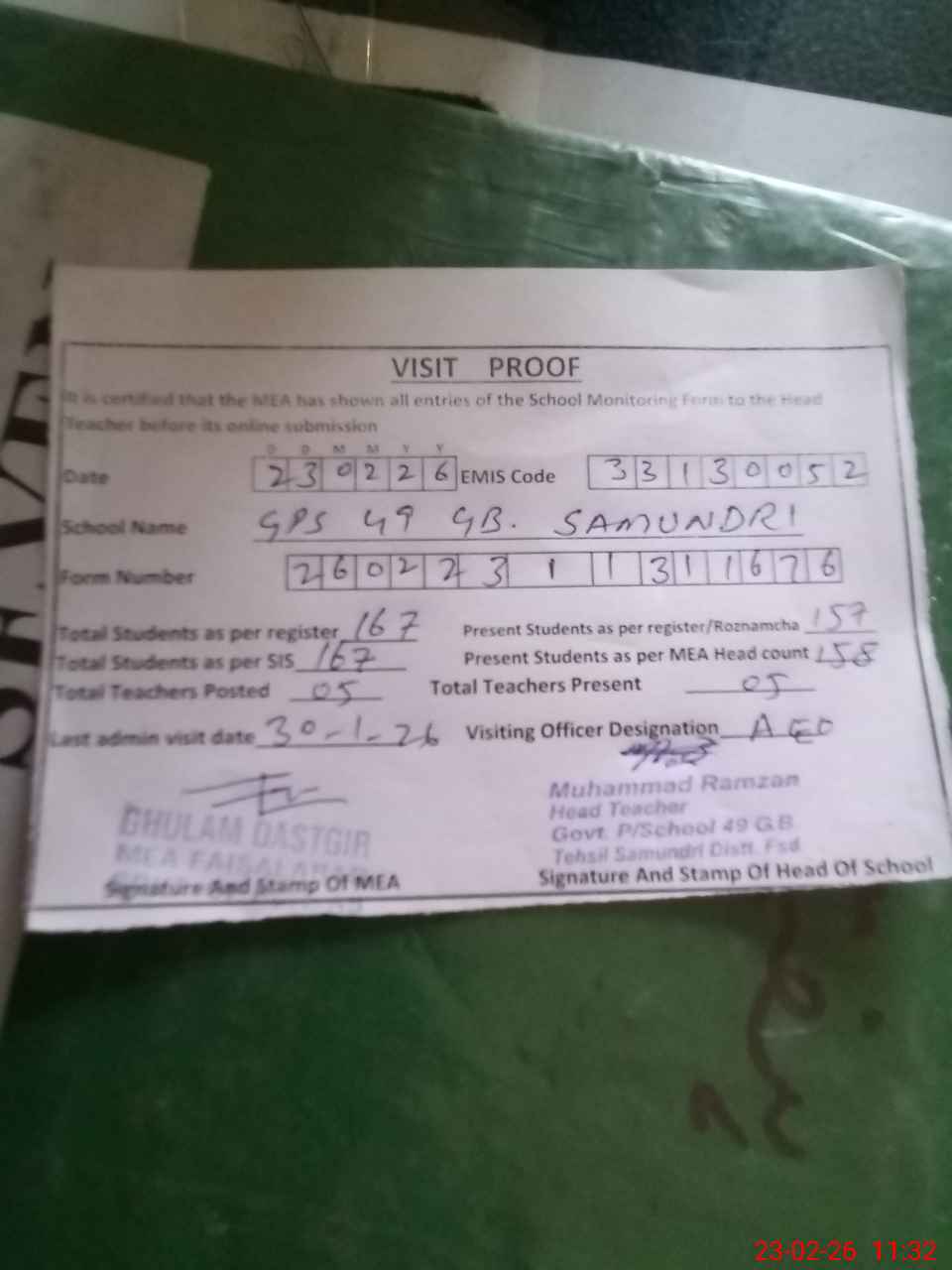 | EMIS Code: 33130052 | Name of School: GPS CHAK 49 GB SAMUNDRI | |||