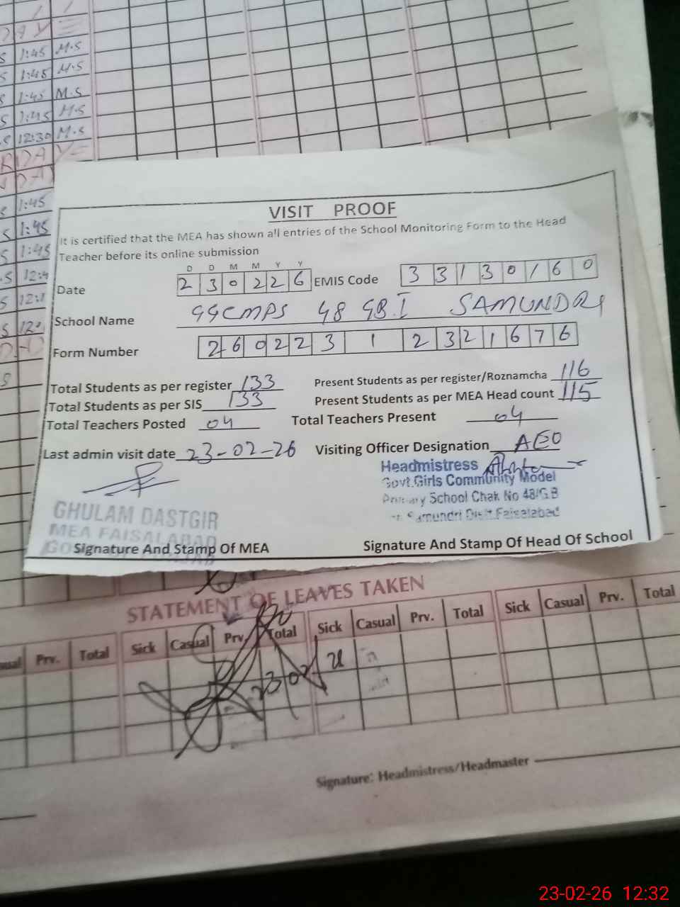 | Attendance Register | Head Teacher | MEA with School | Visit Proof |
