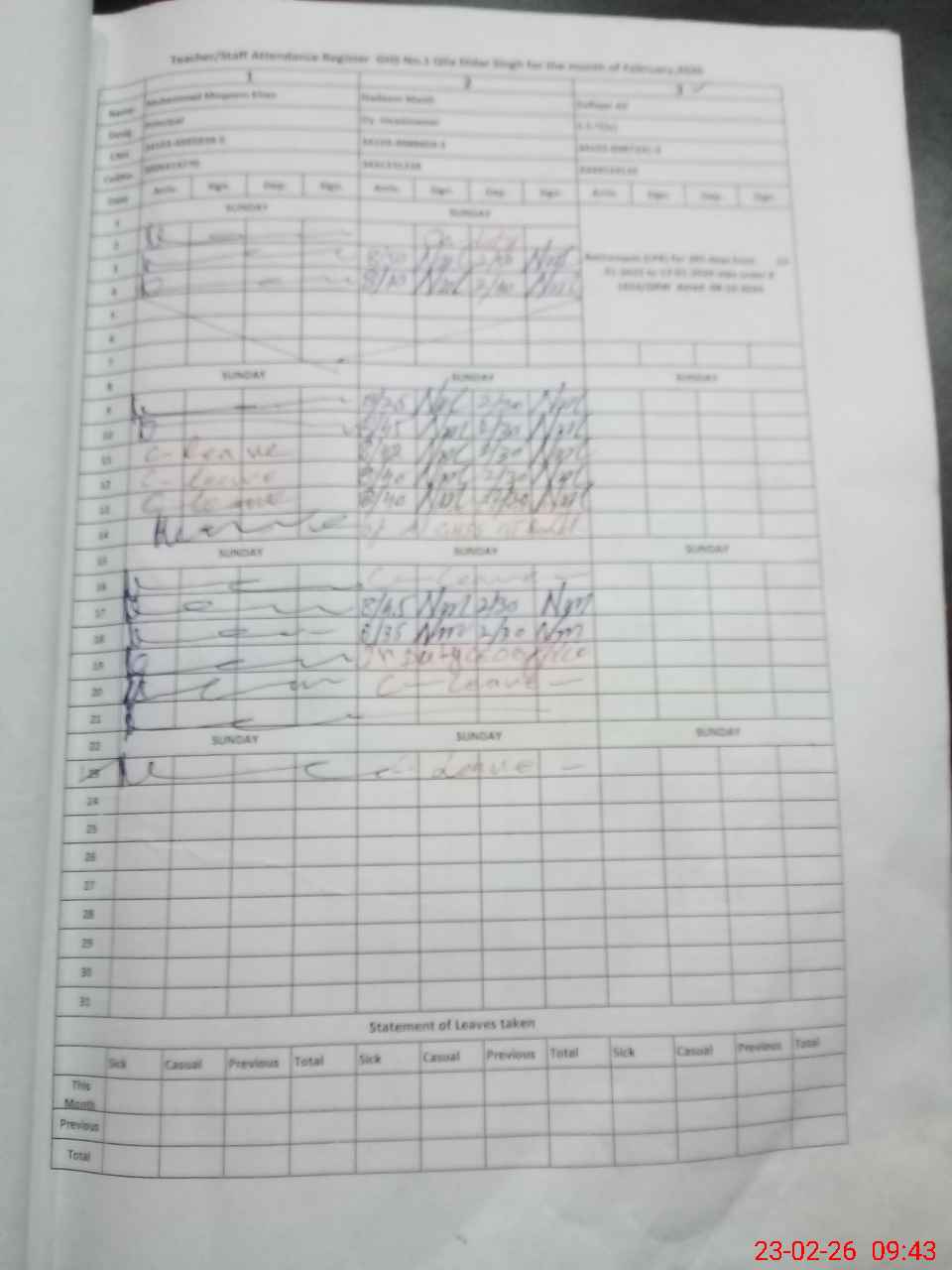 | CNIC | Full Name | Designation | R/C | Absence During Last Calender Month |
