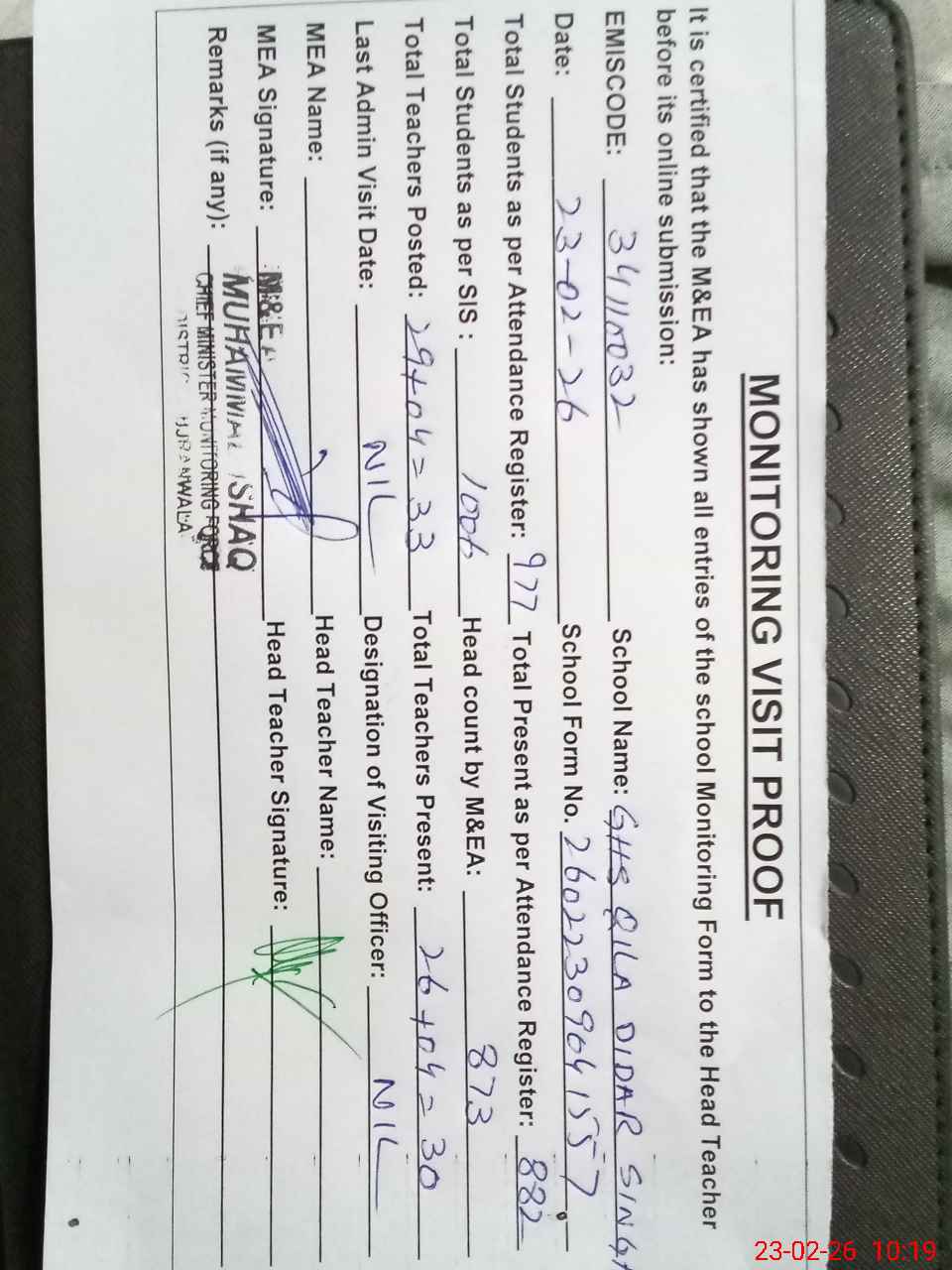 | Attendance Register | Head Teacher | MEA with School | Visit Proof |