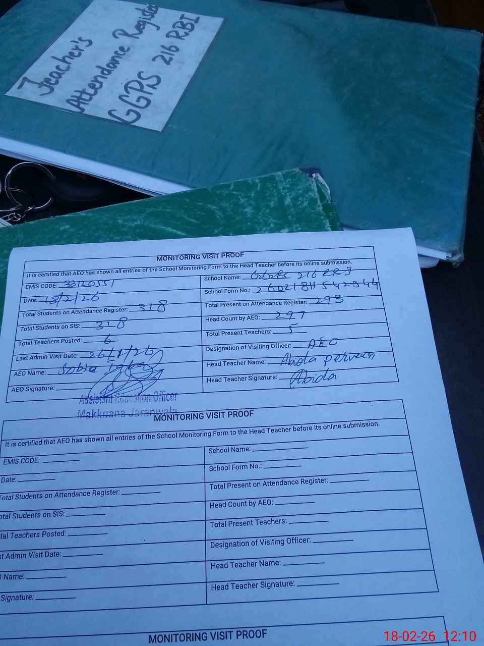 | Attendance Register | Head Teacher | MEA with School | Visit Proof |