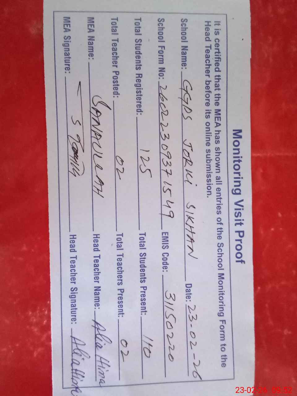 | Attendance Register | Head Teacher | MEA with School | Visit Proof |