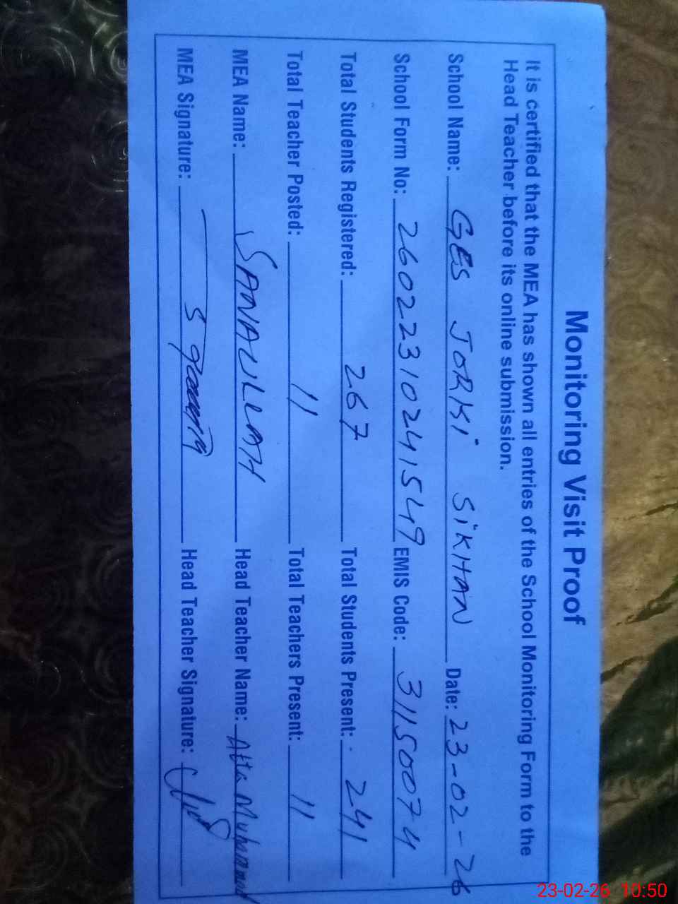 | Attendance Register | Head Teacher | MEA with School | Visit Proof |