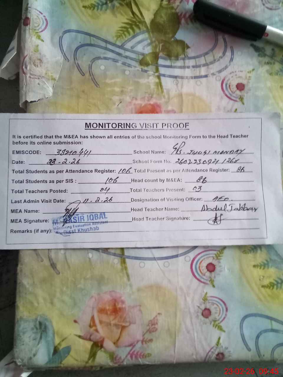 | Attendance Register | Head Teacher | MEA with School | Visit Proof |