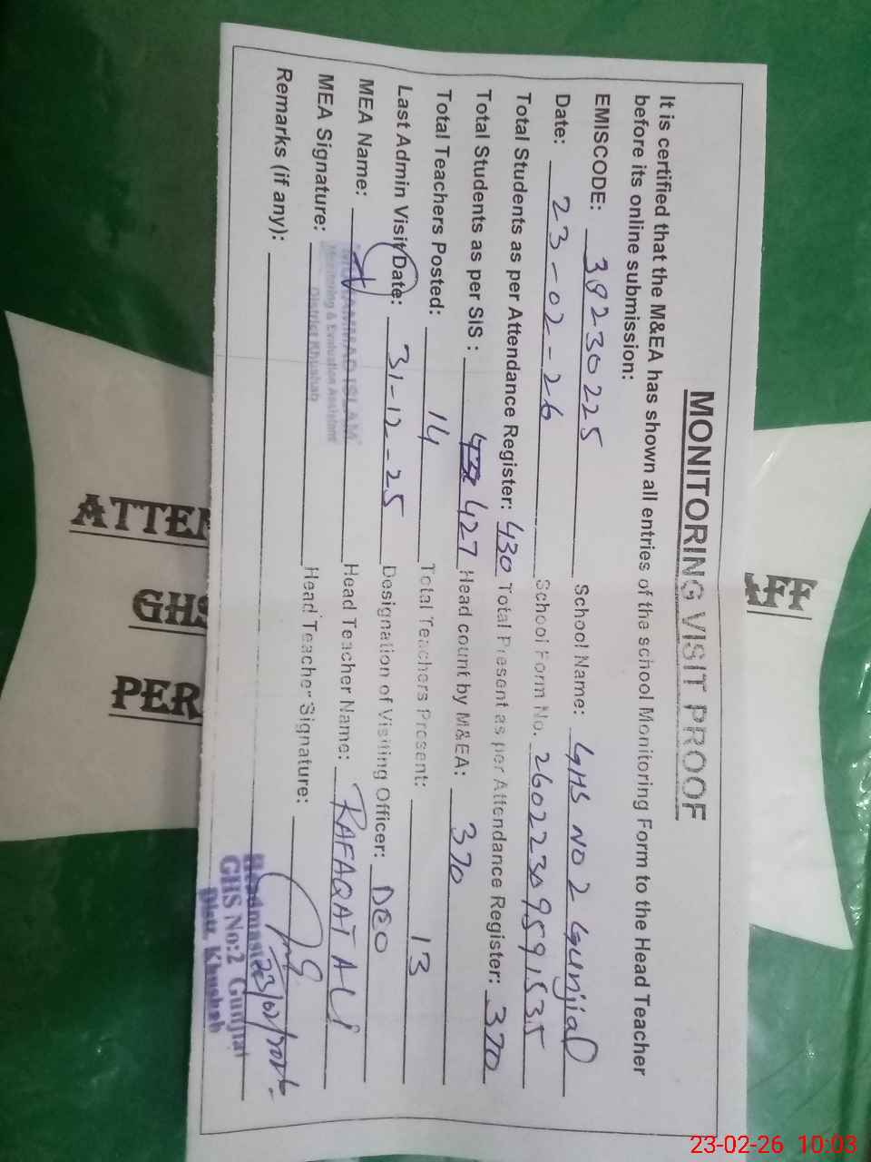 | Attendance Register | Head Teacher | MEA with School | Visit Proof |