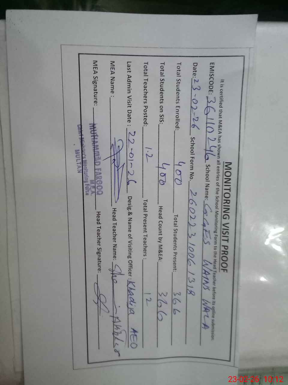 | Certified that this School was Inspected by the Undersigned MEA/DMO Today and the Information Stated Above is as Per Record. | |||||