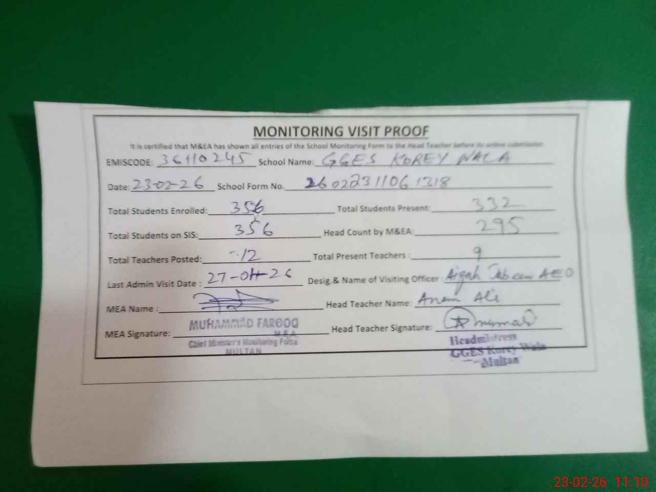 | EMIS Code: 36110245 | Name of School: GGES KOREY WALA MULTAN | |||