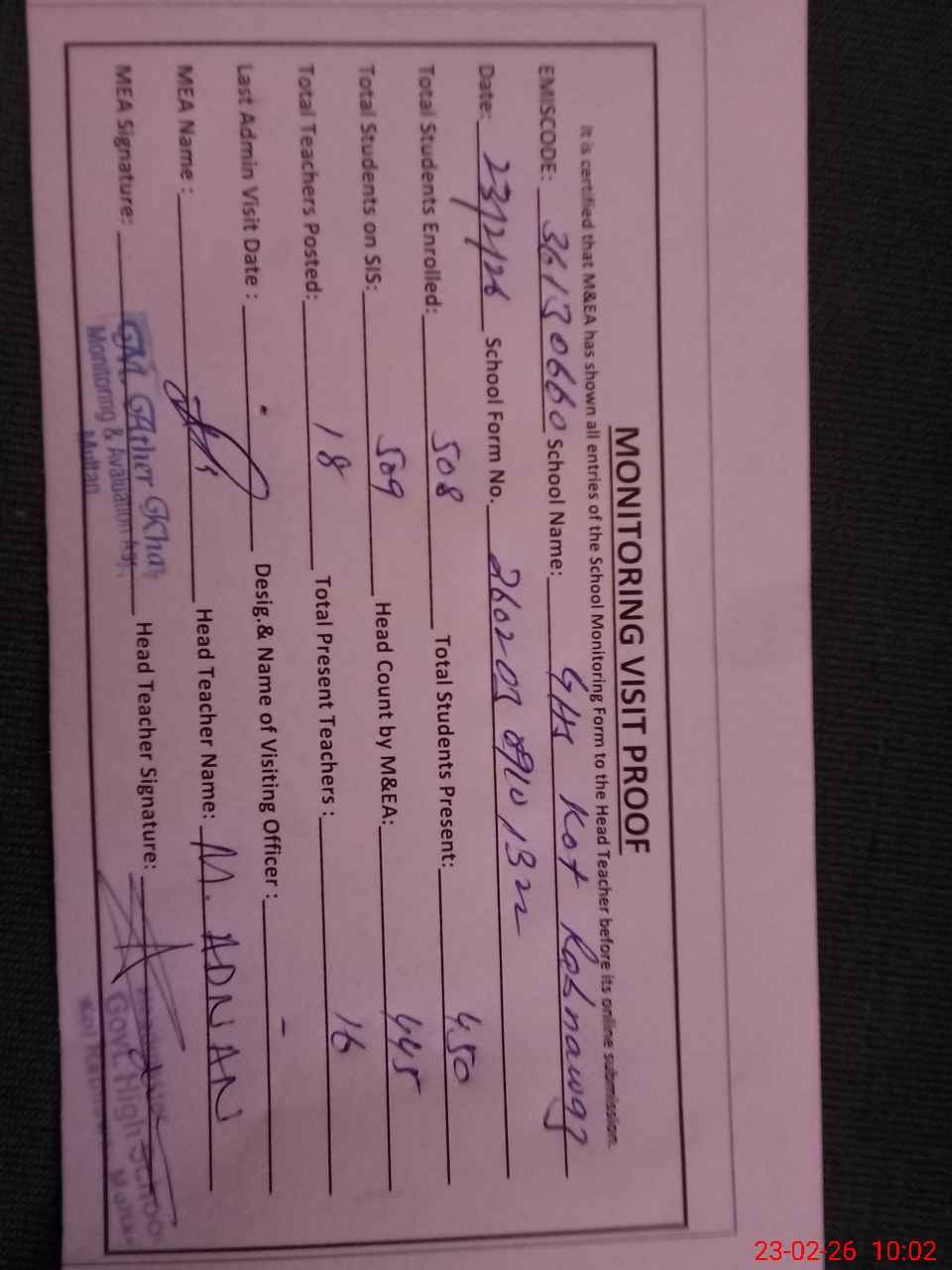 | Attendance Register | Head Teacher | MEA with School | Visit Proof |
