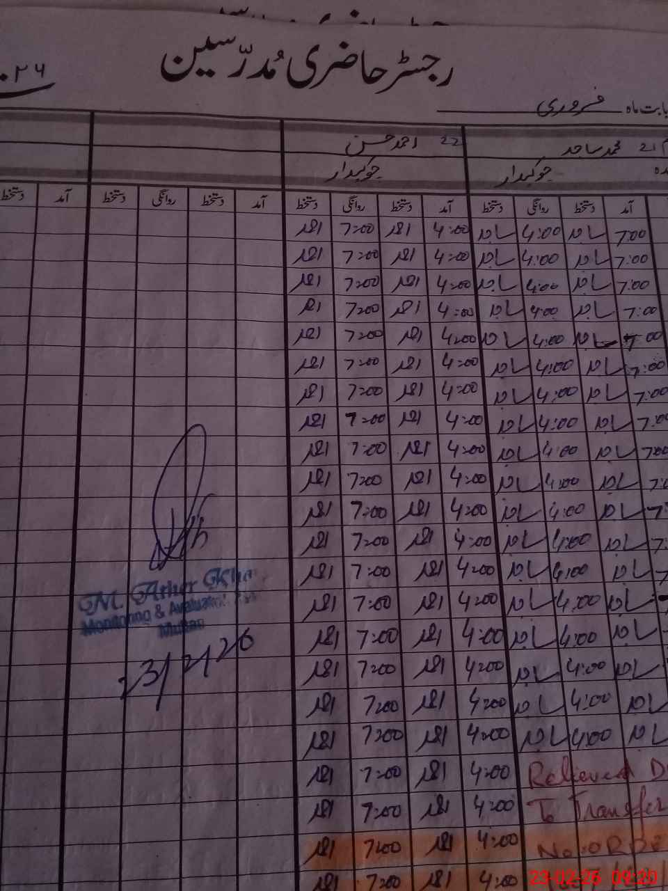 | CNIC | Full Name | Designation | R/C | Absence During Last Calender Month |